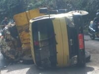 Gegara Hindari Jalan Berlubang Truk Sampah DLH Sukabumi Terguling