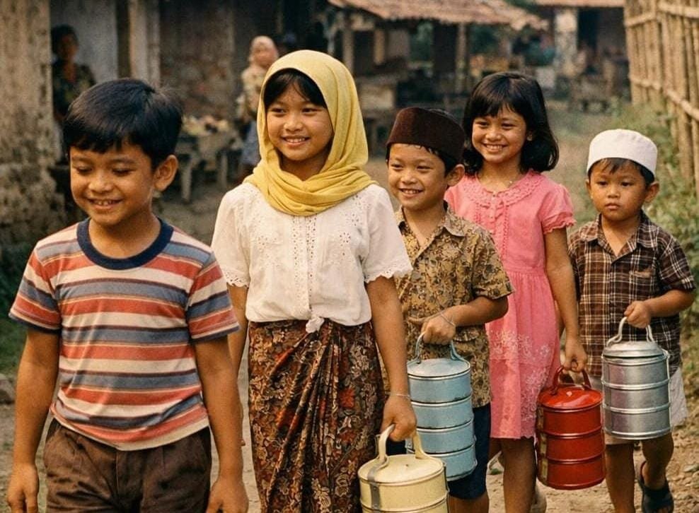 Pada gambar tersebut terlihat anak-anak berjalan beriringan di jalan desa sambil membawa rantangan. Mereka tampak ceria dan saling menemani satu sama lain. Pemandangan sederhana ini menggambarkan kehidupan masyarakat desa pada era 1980-an yang masih kental dengan kebersamaan, gotong royong, dan rasa saling memiliki.